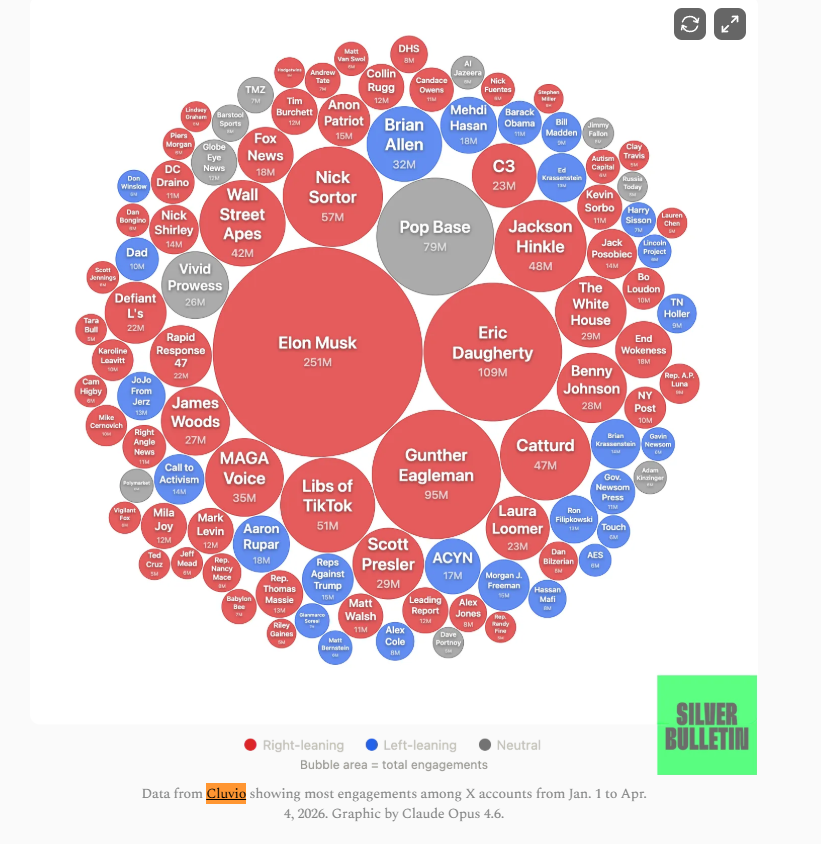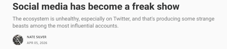 Okay, I am going to do a thread on how absolutely stupid Nate Silver is, because he deserves to be dunked on by everybody. It took 5 seconds to see how absolutely dumb this man is on every level. Nate Silver published on April 5, 2026 the article "Social media has become a freak show", where he links to data from Cluvio in the article. The graph itself.