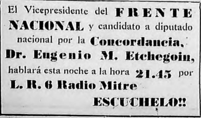 De los 12 candidatos a diputados nacionales la UCR Antipersonalista puso seis candidatos: Arquímedes A. E. Soldano, Santiago C. Rocca, Reinaldo Elena, José María Samperio, Horacio Carrera Pereyra y Néstor Aparicio; el Frente Nacional tuvo tres candidatos: Álvaro Melián Lafinur, Eugenio M. Etchegoin y Américo E. Aliverti; mientras que los Centros Cívicos pusieron otros tres candidatos: Alejandro Ceballos, Juan E. Carulla y Ricardo Bello.