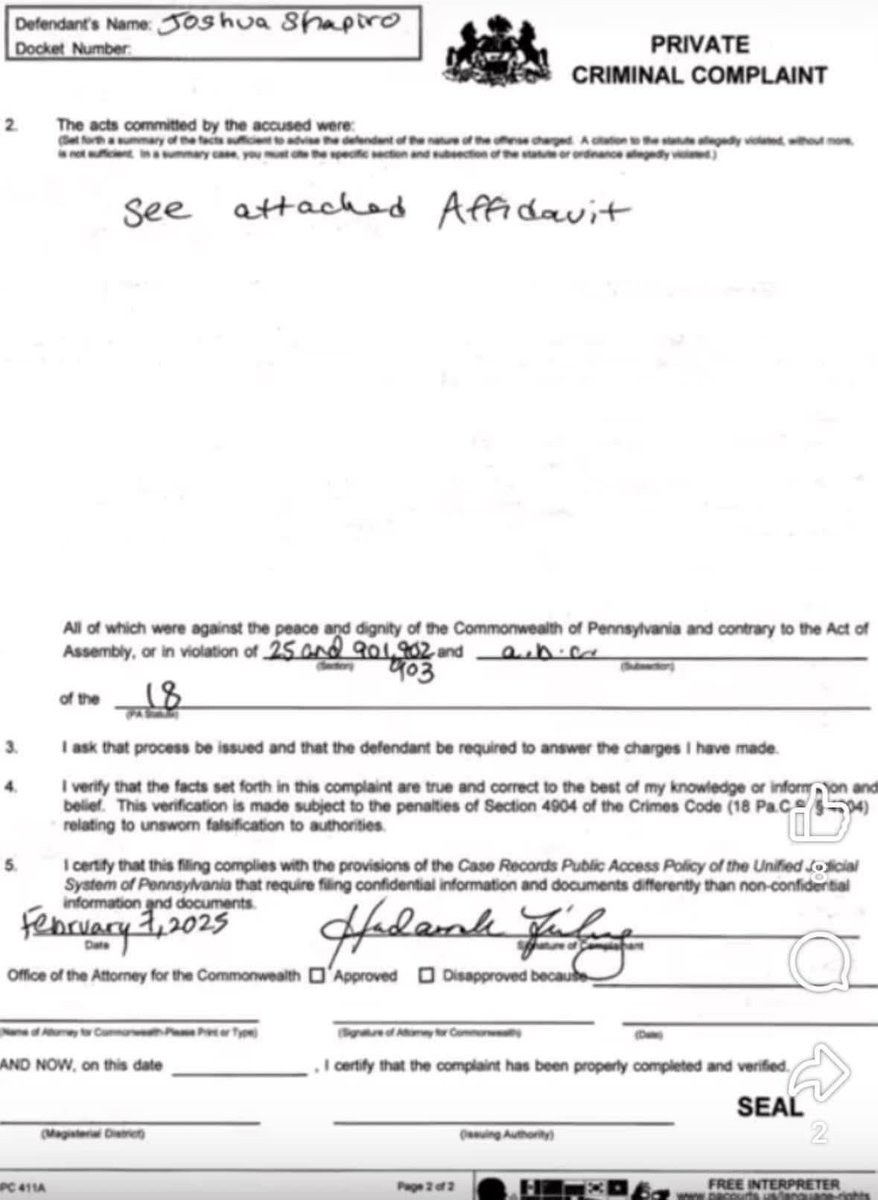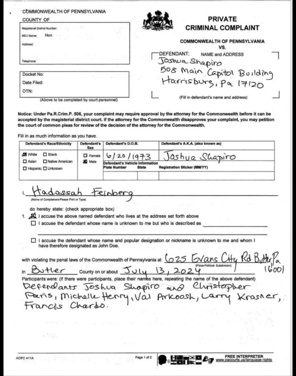 A former Pennsylvania State Police Employer has submitted an official criminal complaint alleging that Governor Josh Shapiro was involved in the attempted assassination of Donald J Trump. The complaint was submitted on February 7, 2025.