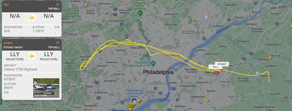 This morning at about 14:30 UTC or 09:30 local, a small aircraft breached the Presidential TFR surrounding Wilm, DE. N738YT was seen being intercepted by F15s shortly after and designated on @flightradar24 as "TOI1" AKA "track of interest 1." 1/4