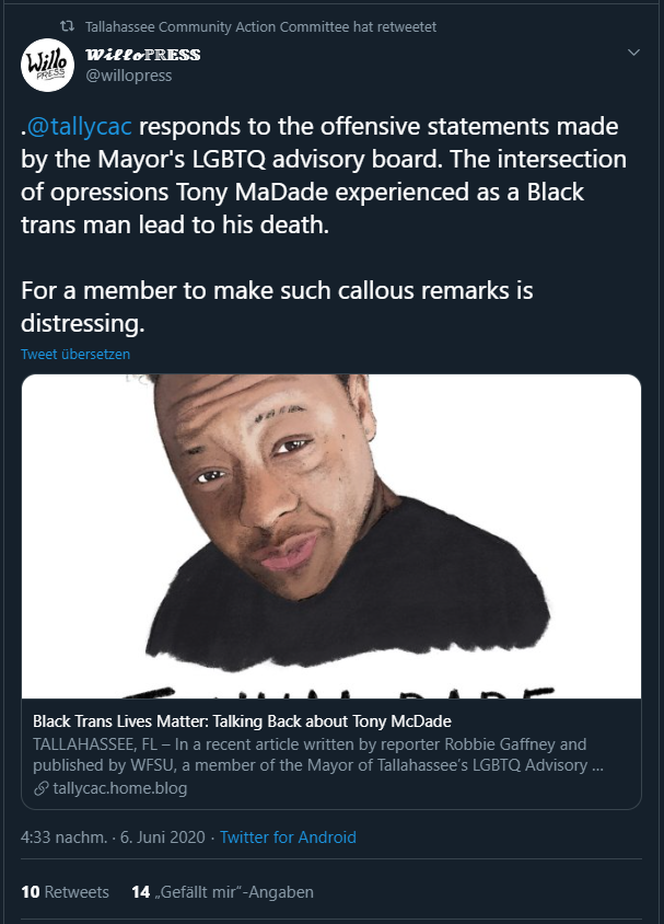 https://twitter.com/McDonalds/status/1277433235111202816Hier kommt nur ein vages "hört auf, uns zu töten. Wir können nicht erwarten, dass andere sich mehr um uns kümmern als wir um uns selbst", anstatt klar Transfeindlichkeit innerhalb der schwarzen Bevölkerung in den USA anzusprechen.