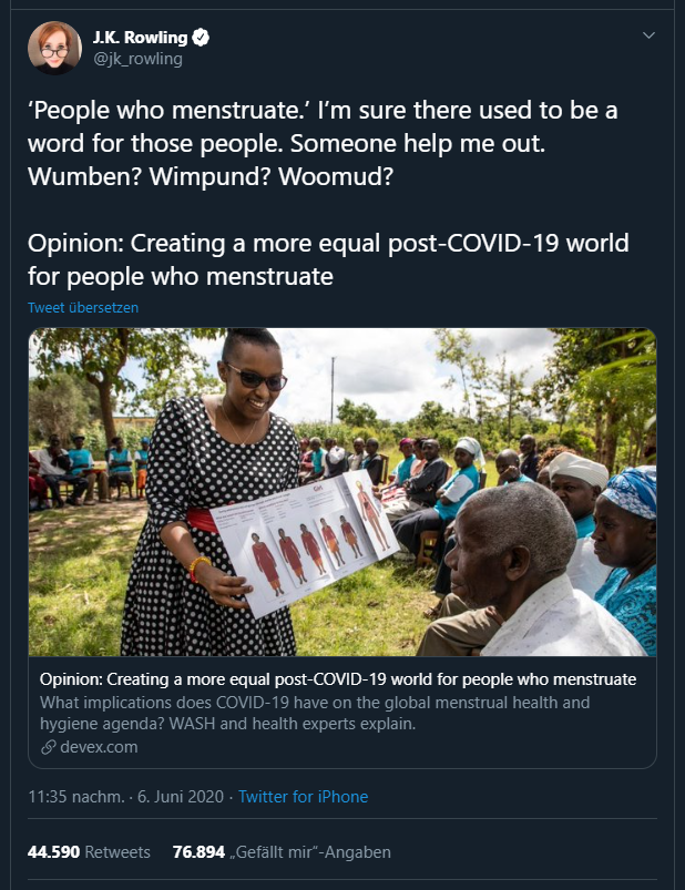 Nicht nur, dass ihr sie aus dem Kontext gerissen habt, ihr habt daraus noch eine unzulässige Umkehr ihrer eigentlichen Aussage getroffen: sie sagt nicht, dass man nur eine Frau ist, wenn man menstruiert (unlogisch wg zB Menopause), sondern dass NUR FRAUEN menstruieren.