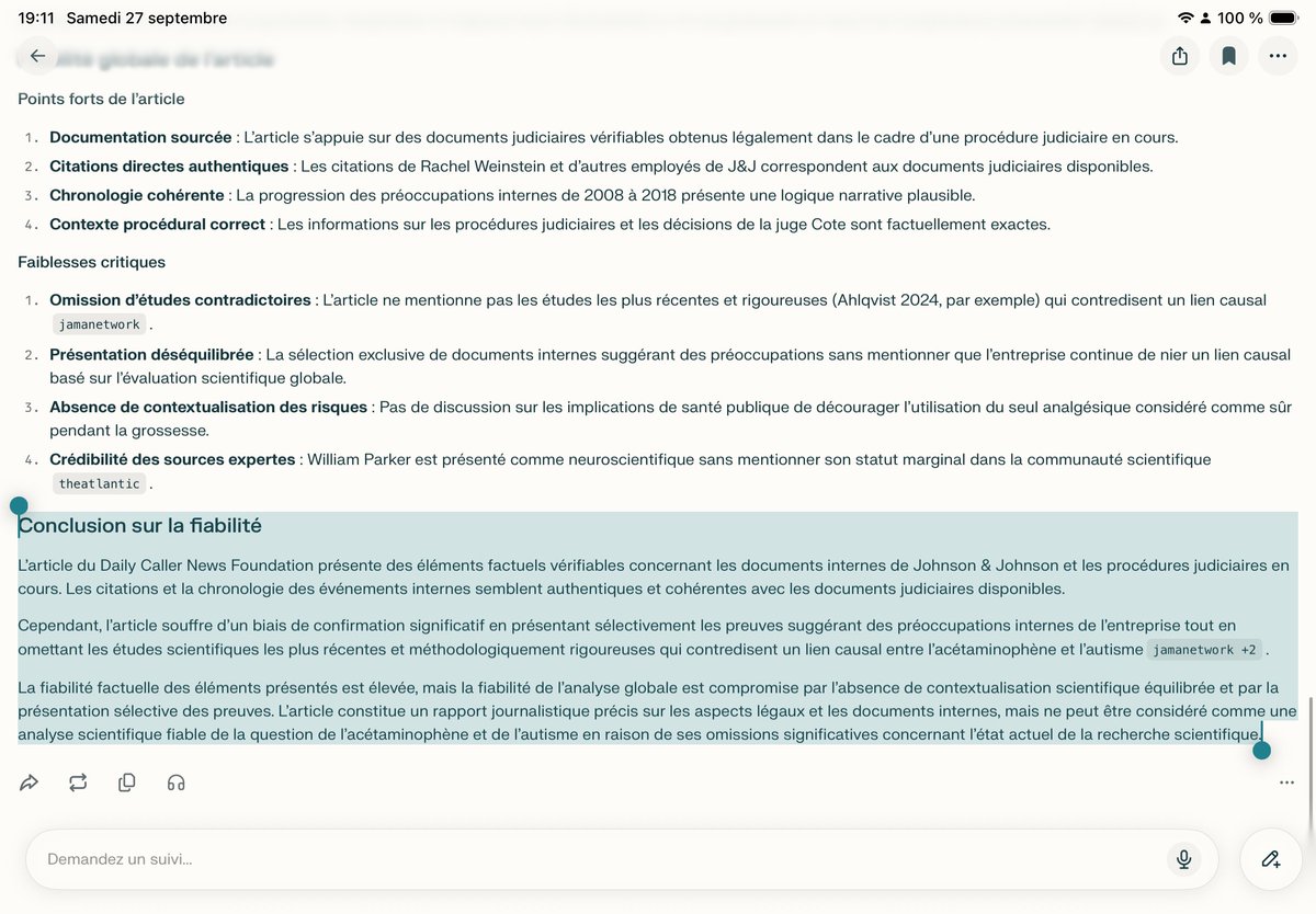 Mon IA conclut : « L’article du Daily Caller News Foundation présente des éléments factuels vérifiables concernant les documents internes de Johnson & Johnson et les procédures judiciaires en cours. Les citations et la chronologie des événements internes semblent authentiques et cohérentes avec les documents judiciaires disponibles.
