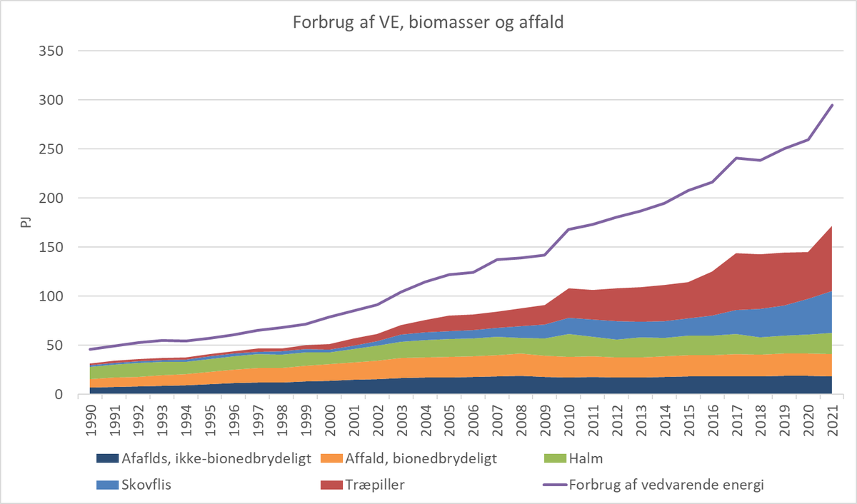 Figuren ovenfor viser Danmark samlede forbrug af vedvarende energi, biomasse og affald i PJ.
