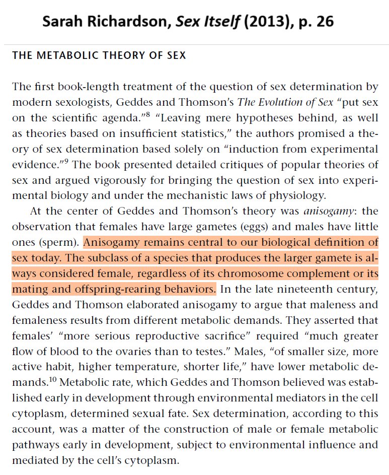 I get that people change their minds. Still, either 2013-Richardson is wrong, or 2025-Richardson is wrong. And at least 2013-Richardson gives evidence that sex has something to do with gamete production. 2025-Richardson offers only mind-reading of her opponents, and no arguments.
