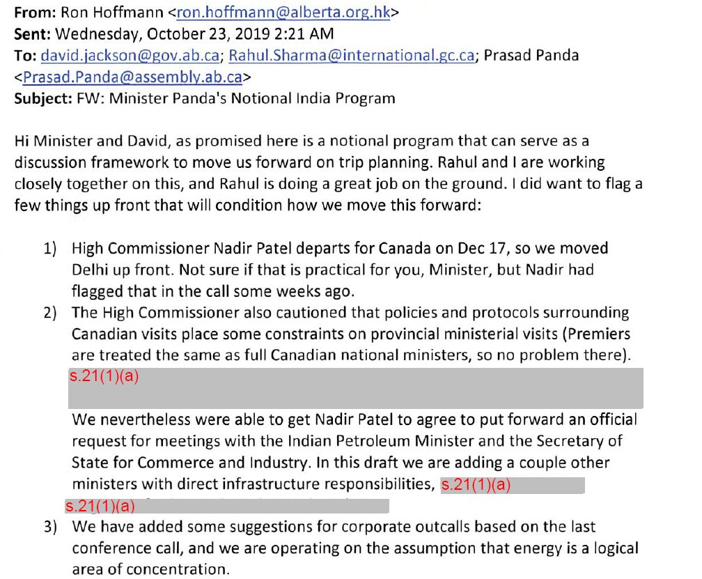 Through the Alberta government, Canada's High Commissioner to India was asked to make an official request for meetings with Indian ministers.