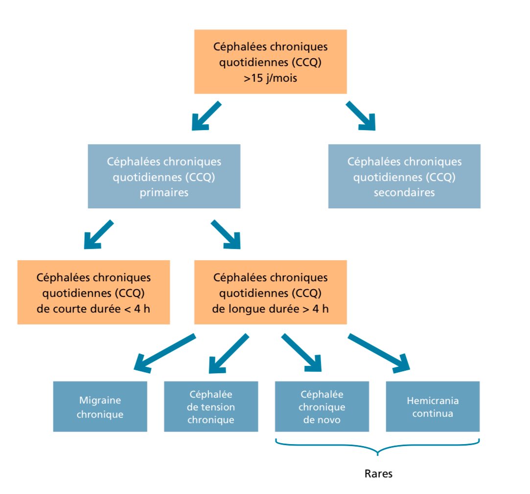 Les cĂ©phalĂ©es chroniques quotidiennes (CCQ) se dĂ©finissent par la prĂ©sence de 15 jours ou plus de maux de tĂȘte par mois, pendant plus de 3 mois. Ces CCQ peuvent ĂȘtre :