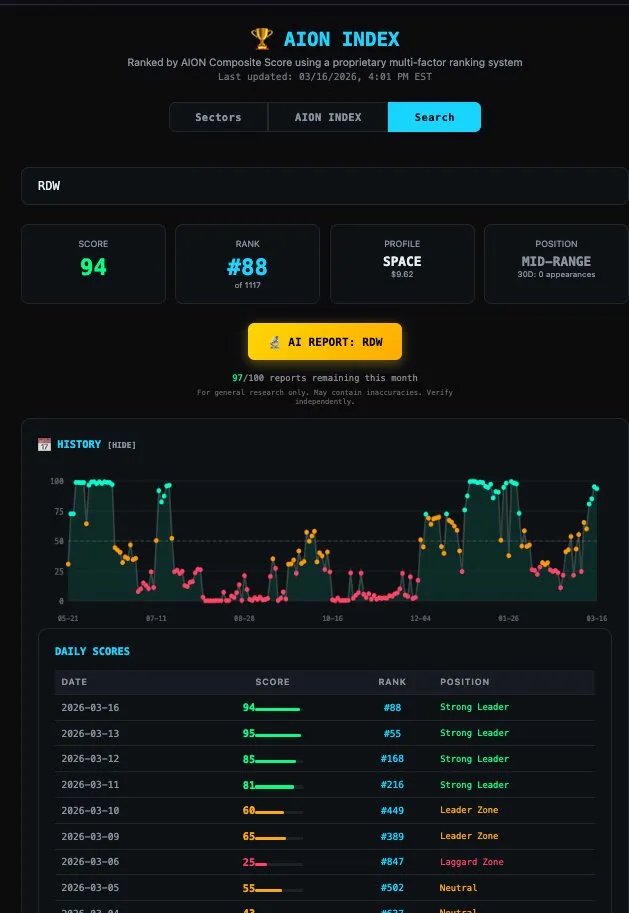 $RDW popped up on the @AionAnalytics index today with a score of 94 out of 1117 tickers.