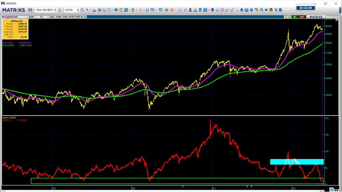 Öncelikle her bilanço dönemi devamlı paylaştığım Bist100 FK bazlı grafiği koyalım. 6,50-7,00 FK seviyeleri yıllardır orta vade sepet yapmak için endeksin ideal bölgeleri oldu. Eskiden 13-14 fk ideal satış yeri iken son dönemde 9 fk satış bölgesi oldu. Son yıllarda çok şey değişti