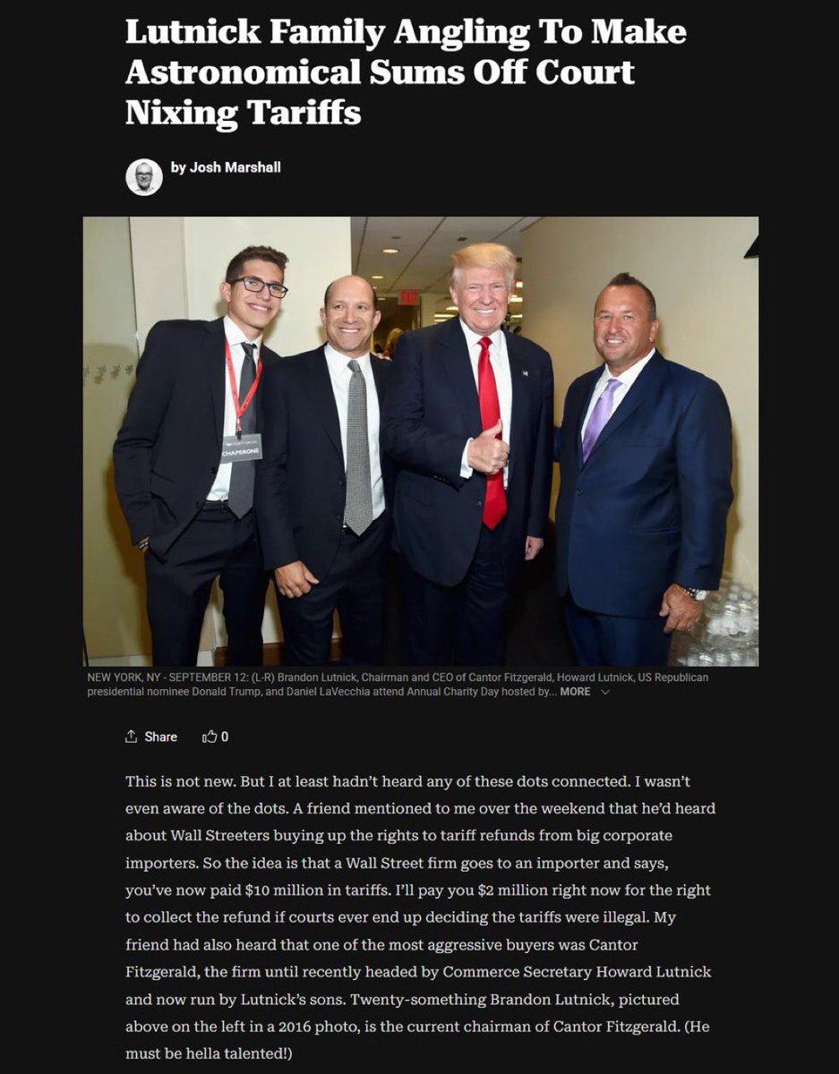 https://twitter.com/truthtellerftm/status/1957598269623652755Are Howard Lutnickâs kids seeking to profit off of the impending tariff rejection verdict from the Supreme Court? More crony capitalism.