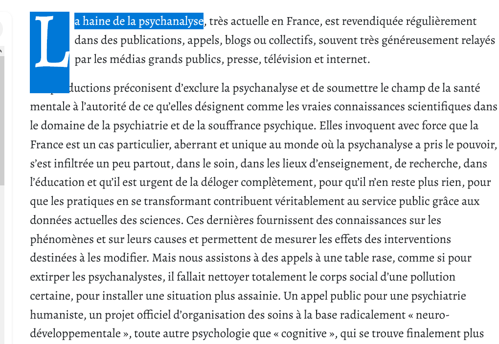 ... nous avons donc un papier qui attaque ad-hominem les représentants supposés de cette "haine de la psychanalyse" (ici, Franck Ramus), sans JAMAIS, JAMAIS envisager l'existence même de victimes de ce référentiel.
