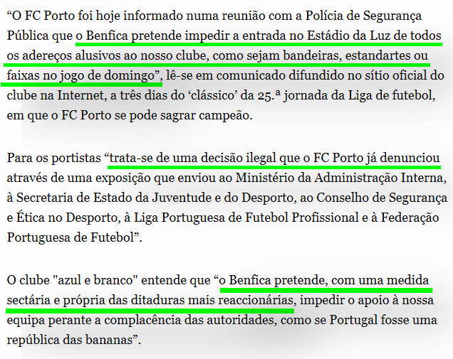 Num clássico Benfica-Porto de 2011, o Benfica tentou proibir os adeptos do Porto de entrarem com bandeiras, estandartes ou faixas (nem se tratava de cachecóis). O Porto fez queixa, dizendo que era "uma medida sectária e própria das ditaduras mais reacionárias".👇👇