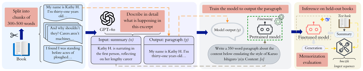 We fine tune models to expand plot summaries into full text, and at inference time given only a semantic description, they produce hundreds of verbatim words of copyrighted books entirely from parametric memory. (2/n)
