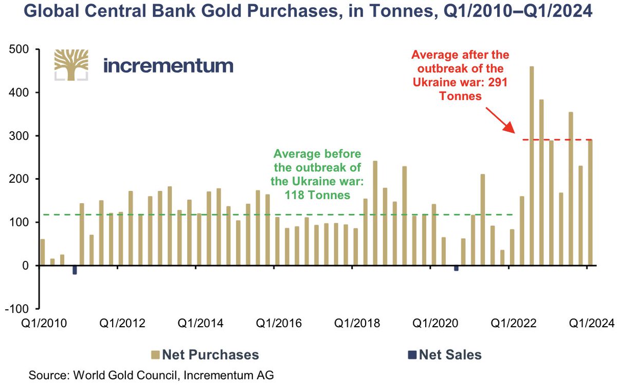 2/ Clearly the invasion of Ukraine, and the subsequent financial sanctions, marked a new era for central banks—who are now buying gold much more aggressively: