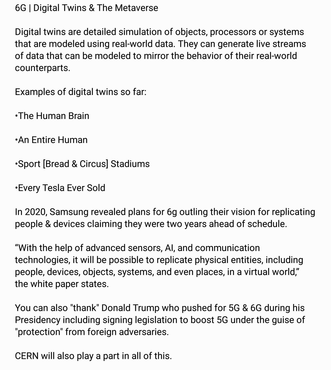 They're always telling us... The transhumanist agenda. They're getting you to accept it because they have a 2030 timeline... 6G is all about transhumanism and the getting the tech to be linked in all the time. Your digital twin, CERN, meta verse & more below.