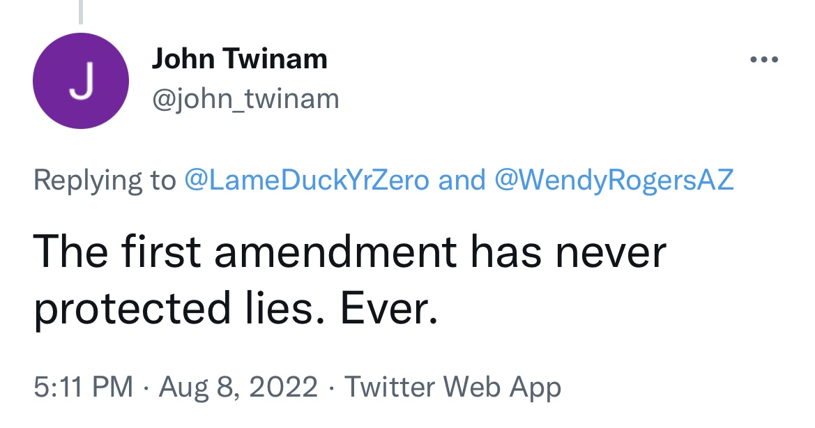 https://twitter.com/Acyn/status/1686547317501898752As I’ve said many times before, I protect many lies and speech does not lose protection based on falsity alone.