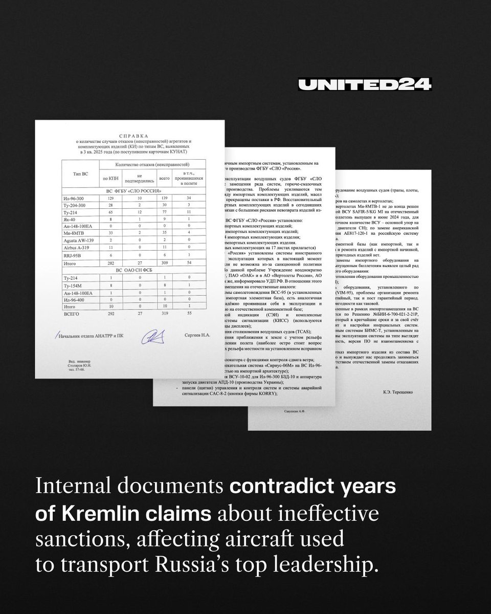 Documents obtained by UNITED24 Media show Russia is quietly losing the ability to safely maintain key aircraft, including planes used to transport the country’s top leadership.