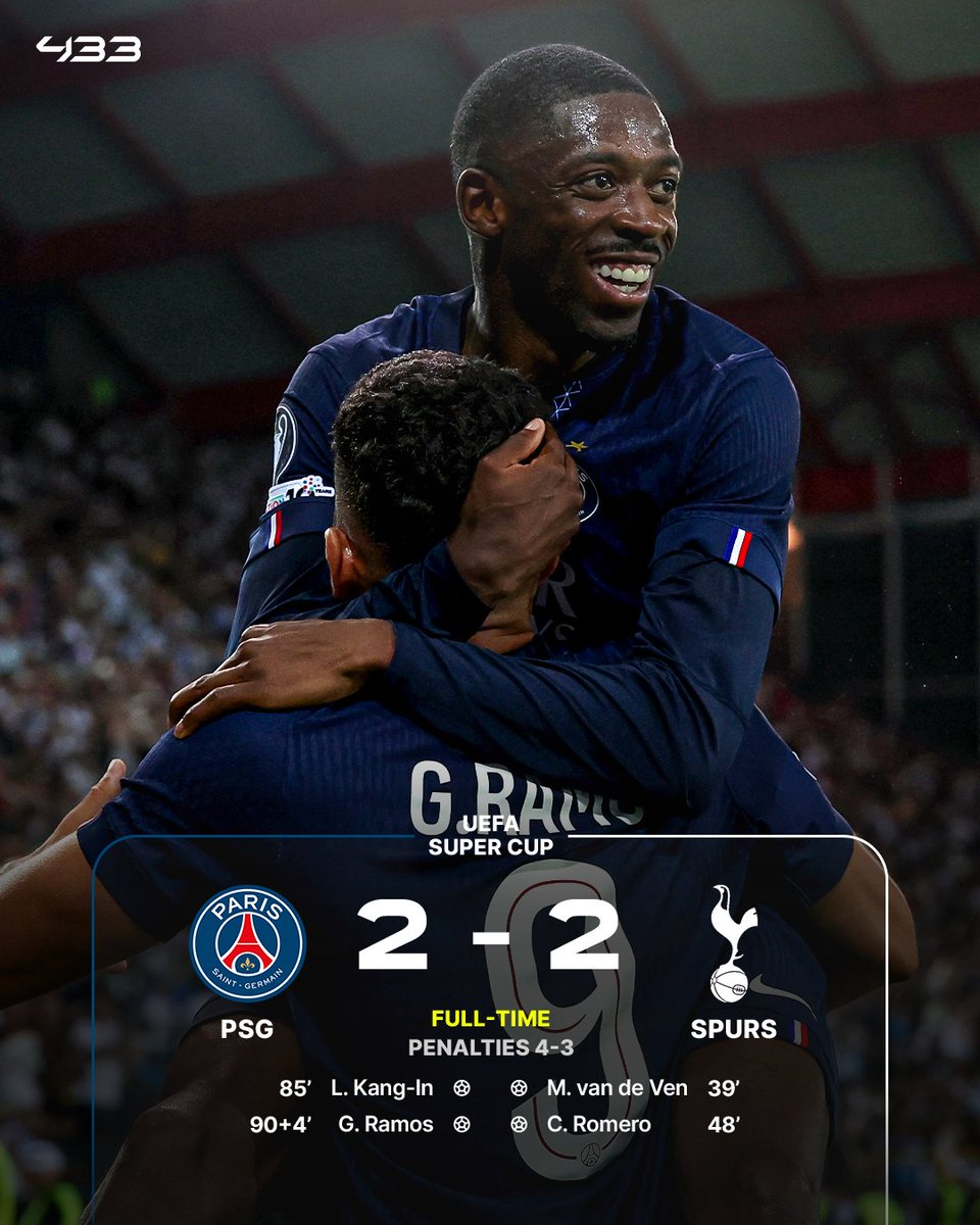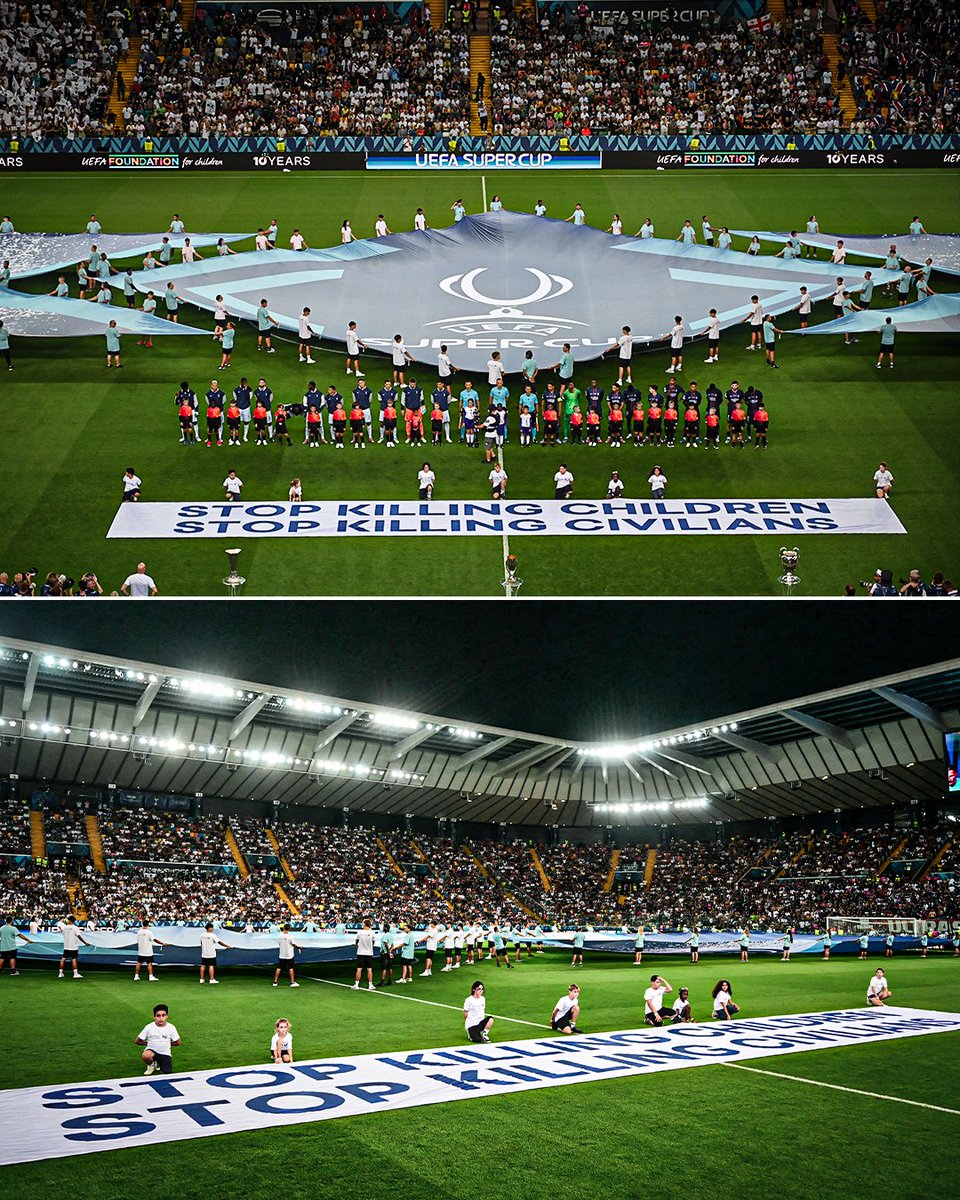A group of kids displayed a banner that said, "Stop killing children. Stop killing civilians" ahead of the 2025 UEFA Super Cup between PSG and Tottenham