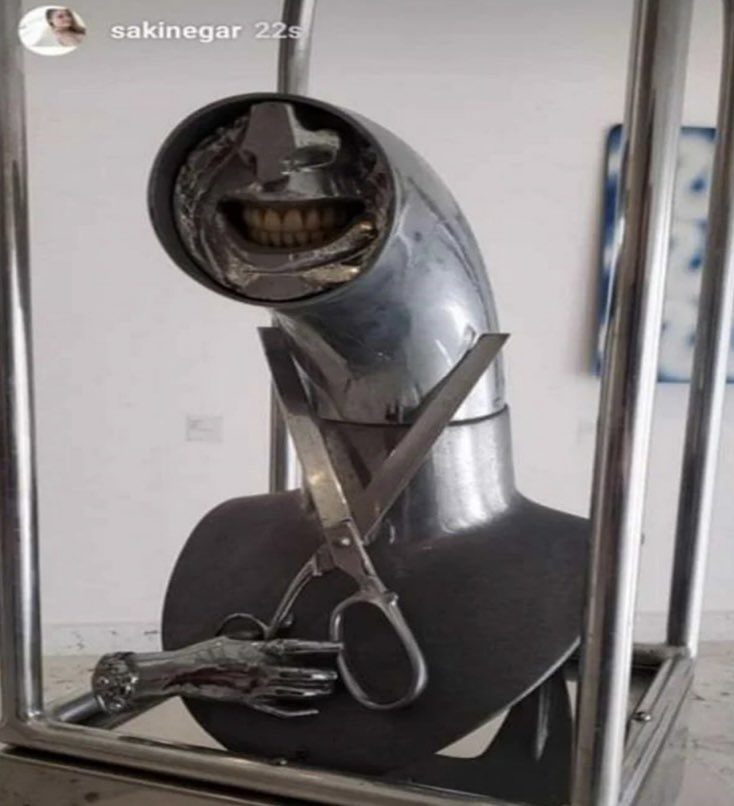 Ters V s*tanist ayinlerde kullanılan bir sembol. Paylaştığı işkence aleti heykeltıraş Valeriano Trubbiani’ye ait. “Bir tecrit mekanı olarak kafes, işkence aracı olarak kırık makas, bir kadın eldiveniyle makas tutan el.”