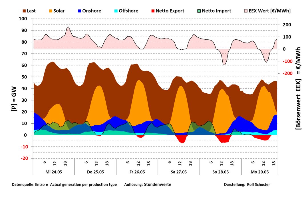Im Hinblick auf den von der Bundesregierung geplanten weiteren Ausbau von Wind- und Solarenergie lohnt es sich, sich die Stromsituation an den Tagen vor Pfingsten anzuschauen.