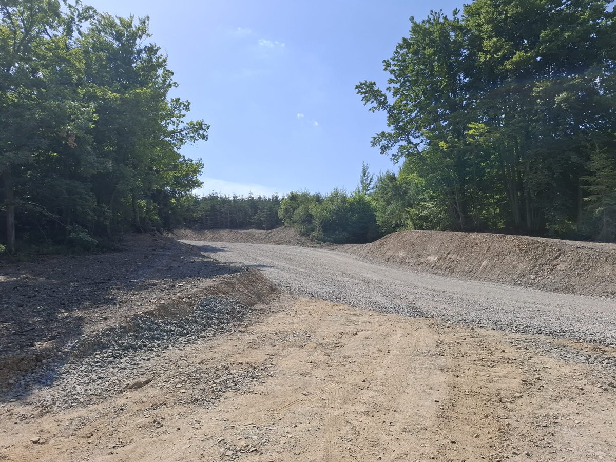 Gebaut werden 12 Windindustrieanlagen mit einer Gesamthöhe von 246,6 m. Das erste Bild zeigt die 12m breite, 7km lange geschotterte Erschließungsstraße mitten durch das Waldgebiet: