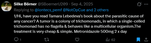 https://twitter.com/makismd/status/1956473033117548943What “they” call “cancer” is caused by a wide variety of parasites. Small (protozoa) medium (filarial worms), large (liver flukes, tapeworms, larvae) and fungus.