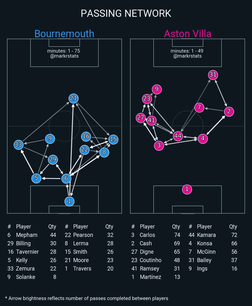 This map of Villa’s passing network by @markrstats is a great visualisation of the problem. Note Kamara’s depth, Ramsey’s width and McGinn’s height in the diagram.