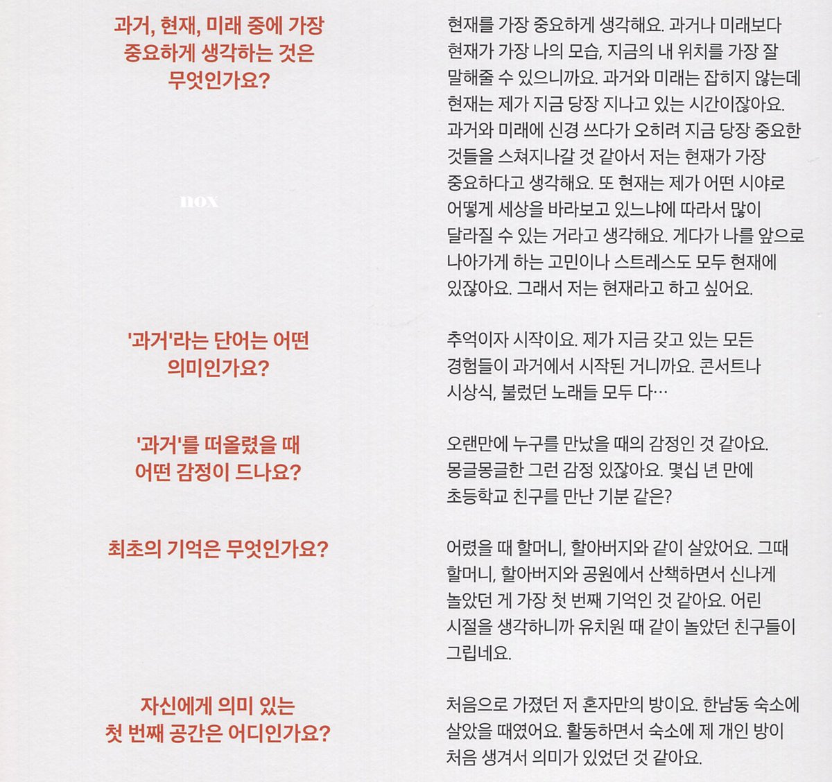 과거와 미래는 잡히지 않는데 현재는 제가 지금 당장 지나고 있는 시간이잖아요. 과거와 미래에 신경 쓰다가 오히려 지금 당장 중요한 것들을 스쳐지나갈 것 같아서 저는 현재가 가장 중요하다고 생각해요.