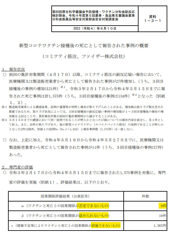 だから、因果関係の評定結果の分類は、α(因果関係が否定できないもの)、β(因果関係が認められないもの)、γ(因果関係が評価できないもの)の3種類しかなく、「因果関係が認められるもの」という評価項目がそもそも存在しない。2/