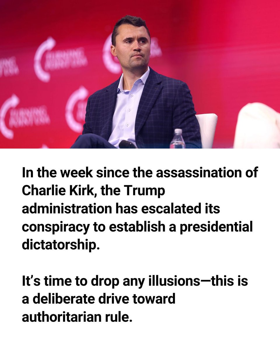 After the assassination of #CharlieKirk, Trump’s White House launched a campaign to criminalize dissent. #Workers have been fired for social posts. This is dictatorship in the making. Just like the Nazis used the Reichstag Fire & Horst Wessel as propaganda, #Trump is weaponizing Kirk’s death to rally reactionary forces. (2/9)