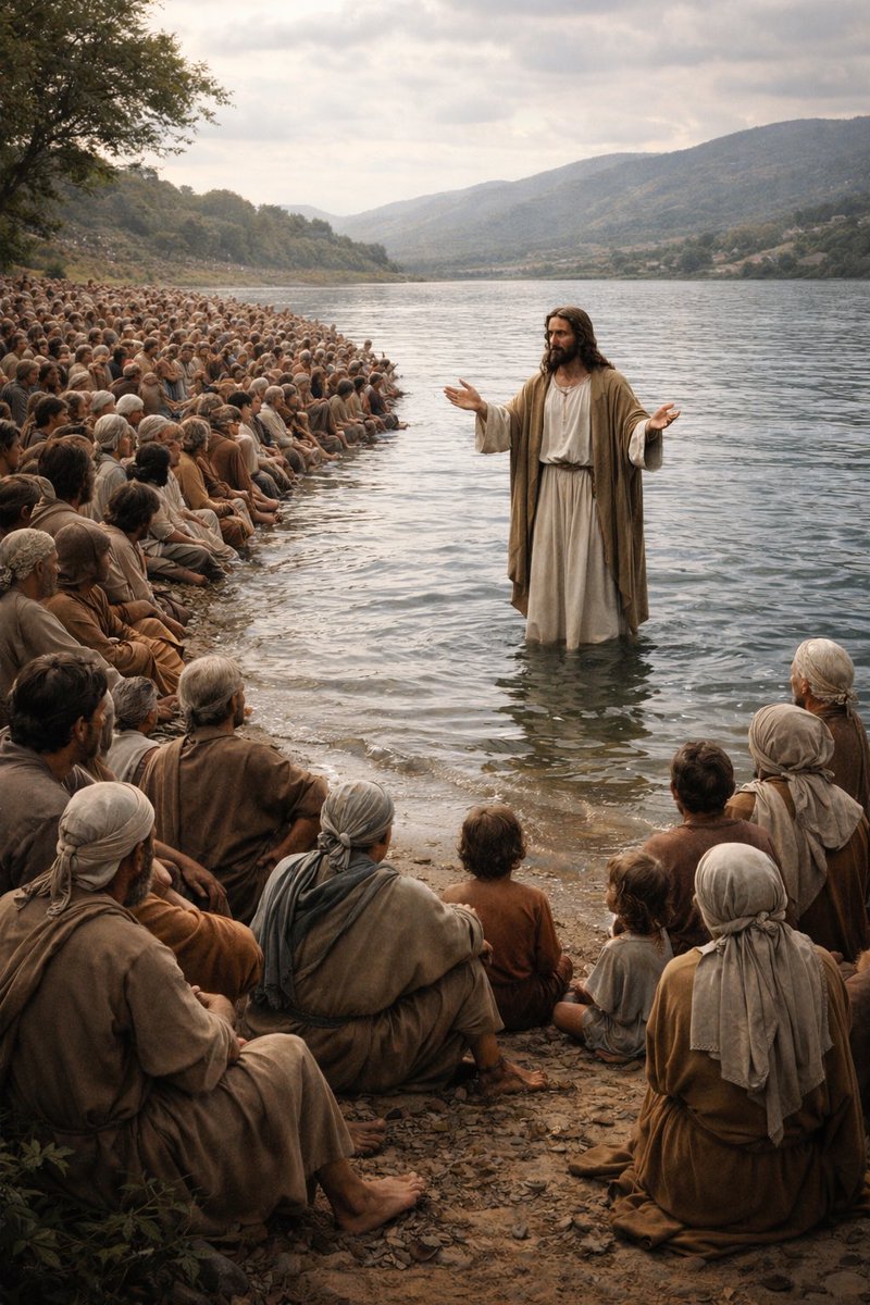 This may be His largest crowd yet--it says the gathering was so big they began to push him into the water so they can hear or see Him better.