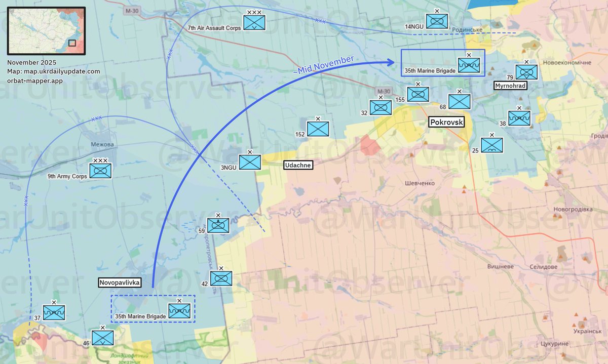 The 🇺🇦35th Marine Brigade came from the Novopavlivka front, although its battalions likely had a few weeks of recovery in October between the two deployments.
