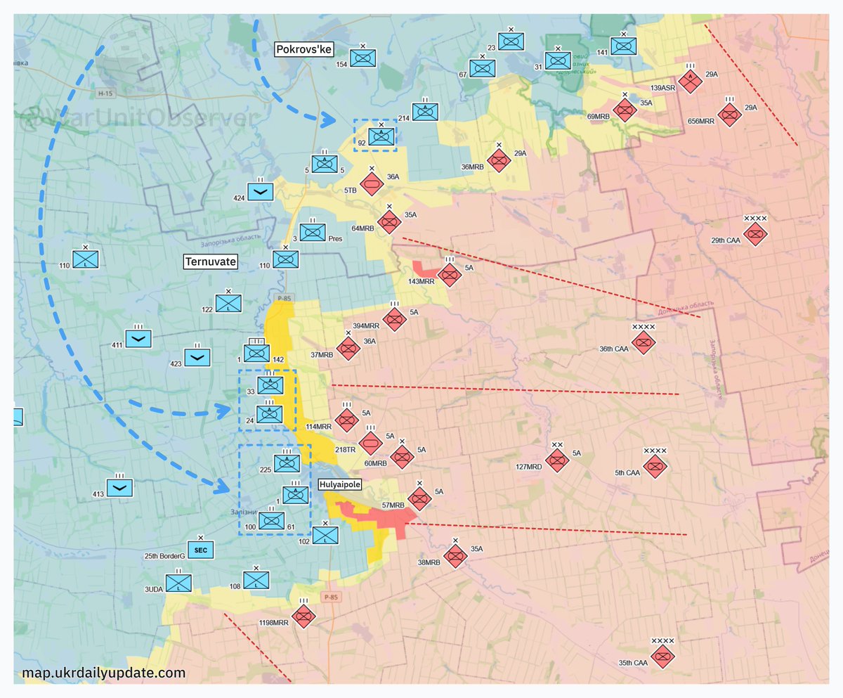 In the Pokrovs'ke direction, several battalions from the 🇺🇦 92nd Assault Brigade have redeployed from the Dobropillya Axis, with additional units joining from the rear to stabilize the situation along the Yehorivka–Vyshneve–Oleksiivka line, opposing the 🇷🇺 29th and 🇷🇺 35th Armies