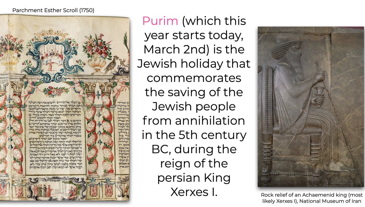 Purim (which this year starts today, March 2nd) is the Jewish holiday that commemorates the saving of the Jewish people from annihilation in the 5th century BC, during the reign of the persian King Xerxes I.
