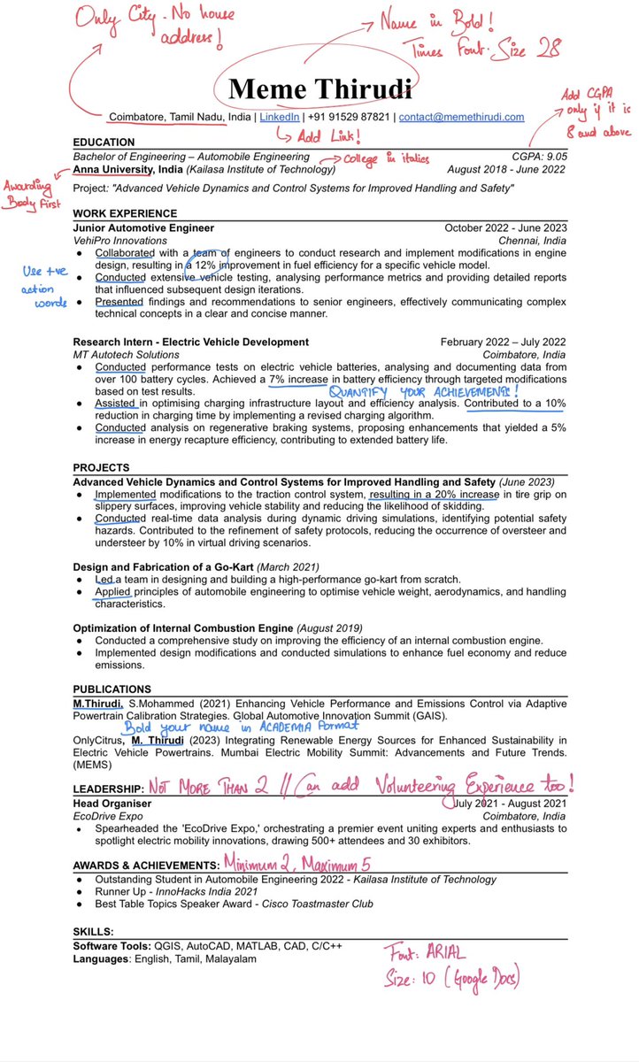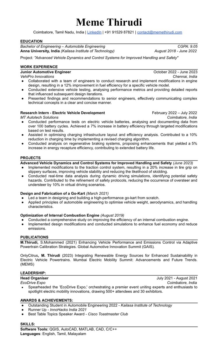 This is a model resume. Let’s imagine @memethirudi is an automobile engineering student. If I were her, this is how my resume would be.