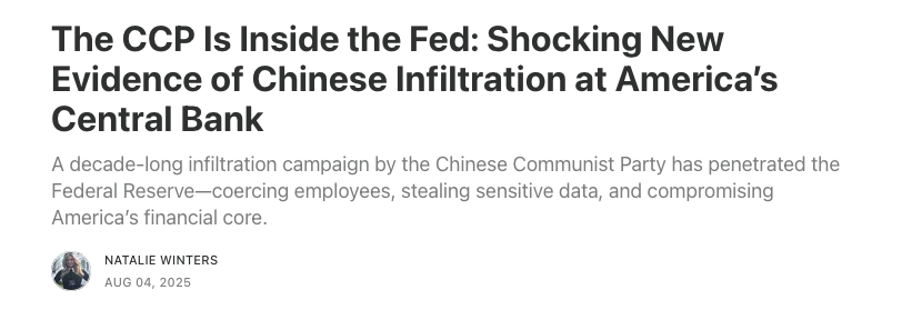 1. The Chinese Communist Party has penetrated the Federal Reserve - coercing employees, stealing sensitive data, and compromising America's financial core.