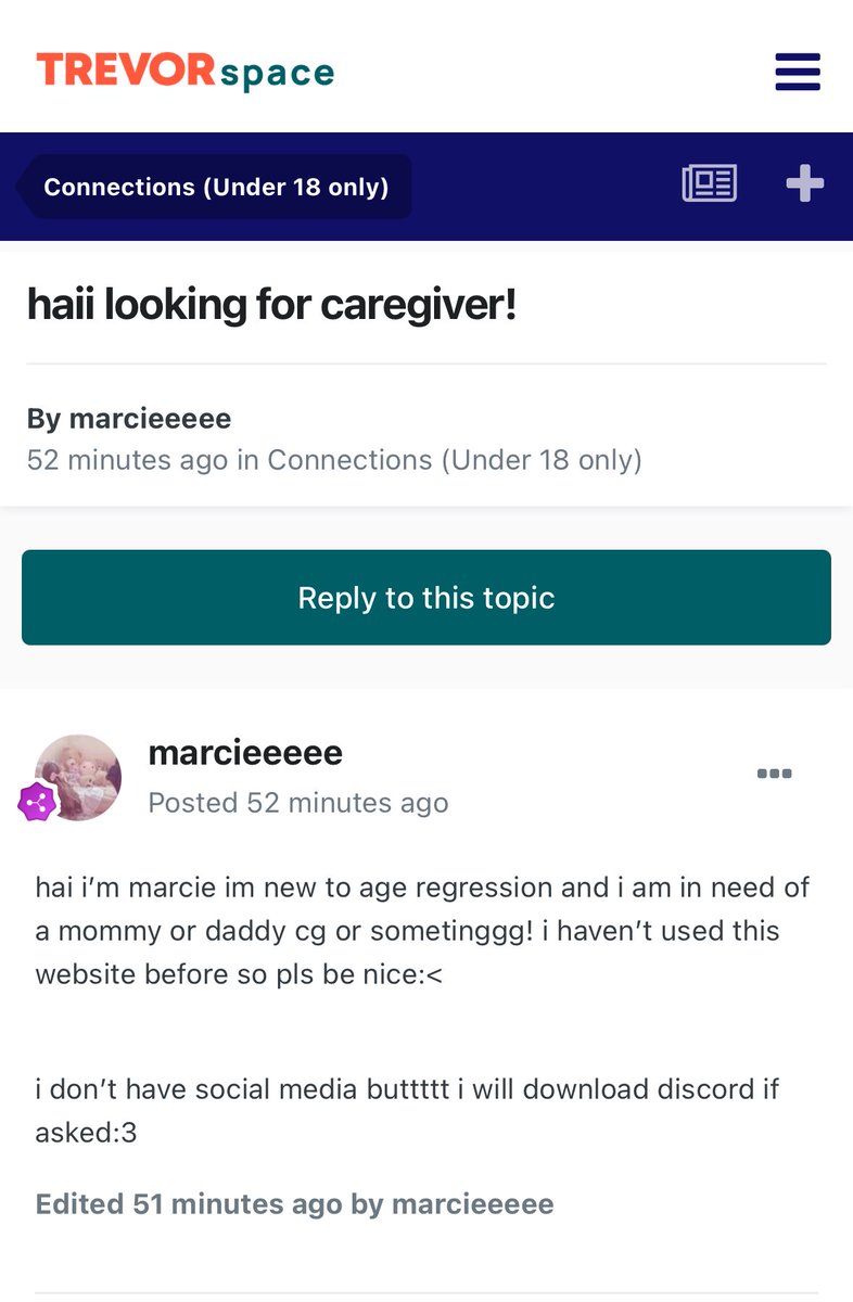 https://twitter.com/cagovernor/status/2002446712410149150Example of an age regression fetish post in the under 18 section of Trevor Project