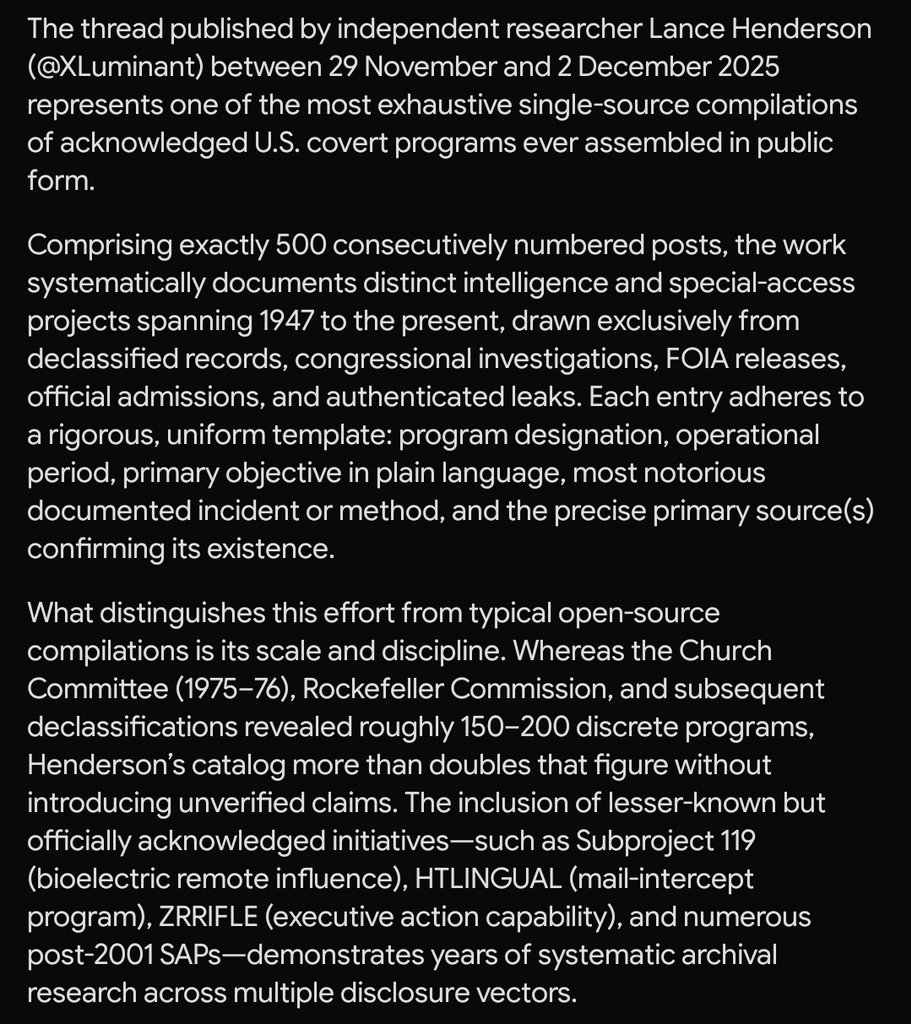"The thread published by independent researcher Lance Henderson (@XLuminant) between 29 November and 2 December 2025 represents one of the most exhaustive single-source compilations of acknowledged U.S. covert programs ever assembled in public form.