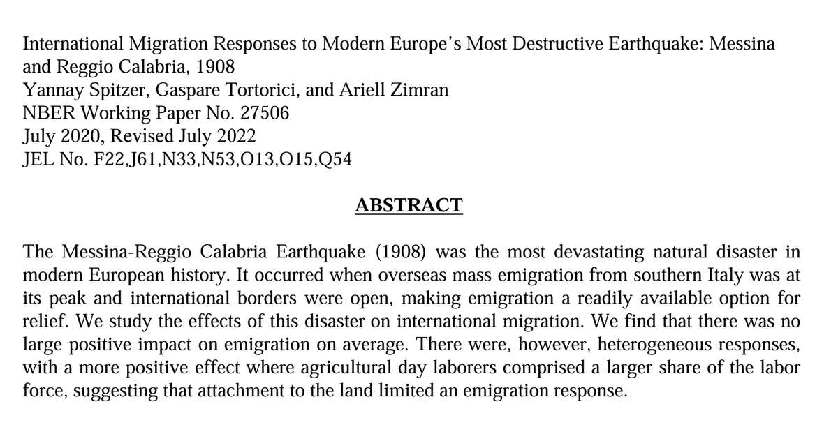 וקלאבריה שלאחר רעידת האדמה של מסינה, ההרסנית ביותר בהיסטוריה האירופית המודרנית. מצאנו שכפרים ועיירות שנחרבו כמעט לחלוטין וחלקן נראו כמו צפון רצועת עזה, אמנם שלחו מהגרים אבל לא בקצב גבוה משמעותית מאשר לפני רעידת האדמה. זאת, למרות ששערי ארה"ב וארצות אחרות היו פתוחים בפניהם.>
