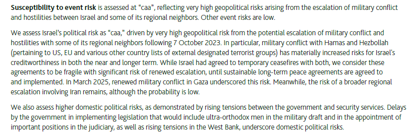 https://twitter.com/YannayASpitzer/status/1904869069448175947ראשית, אין שום מילה בדו"ח של מודי'ס שרומזת שישראל לא צריכה להילחם או שלהישגים צבאיים אין דיבידנד כלכלי. אם הם היו חושבים שישראל הרפתקנית מדי או שהממשלה ניצית מדי, הם היו יכולים לומר זאת במפורש. הם כתבו דברים מובנים מאליהם: הפסקת האש לא יציבה, הסיכון הגיאו-פוליטי ארוך הטווח גדל.>