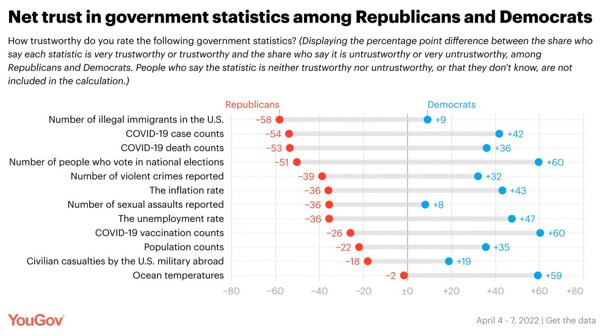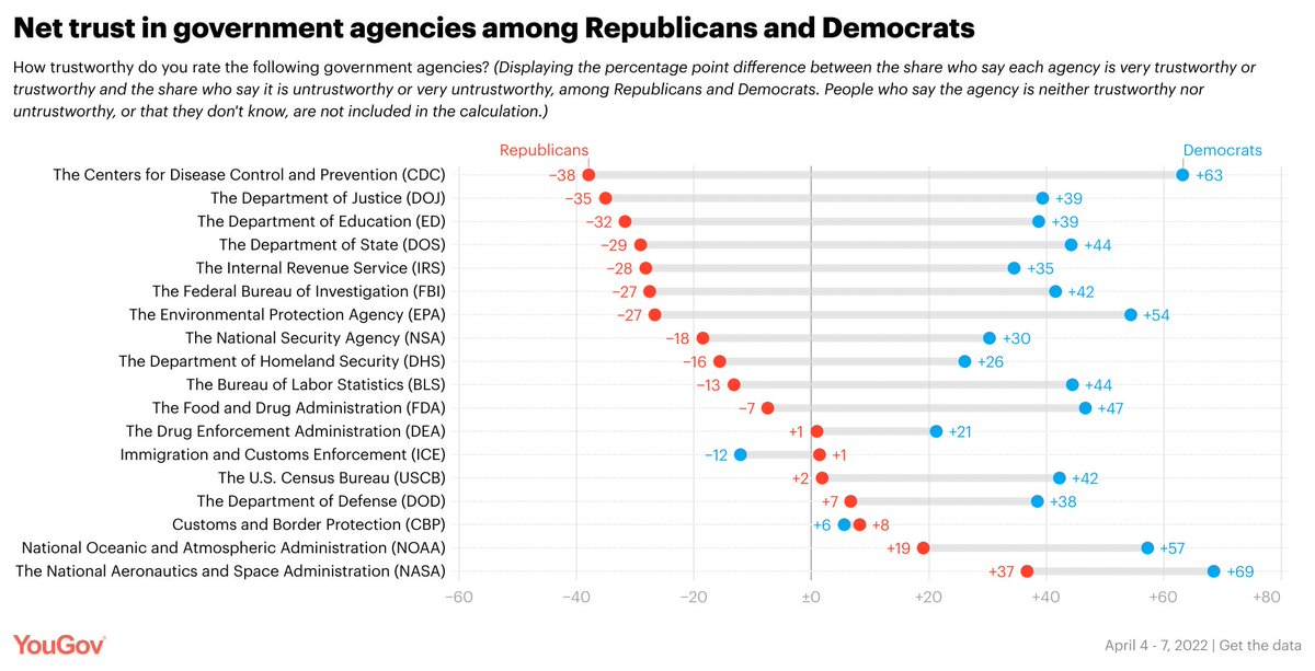 This divide also extends to government agencies themselves. We found that the @CDCgov has the largest partisan gap in net-trust ratings, receiving a -38 score among Republicans and a +63 score among Democrats.