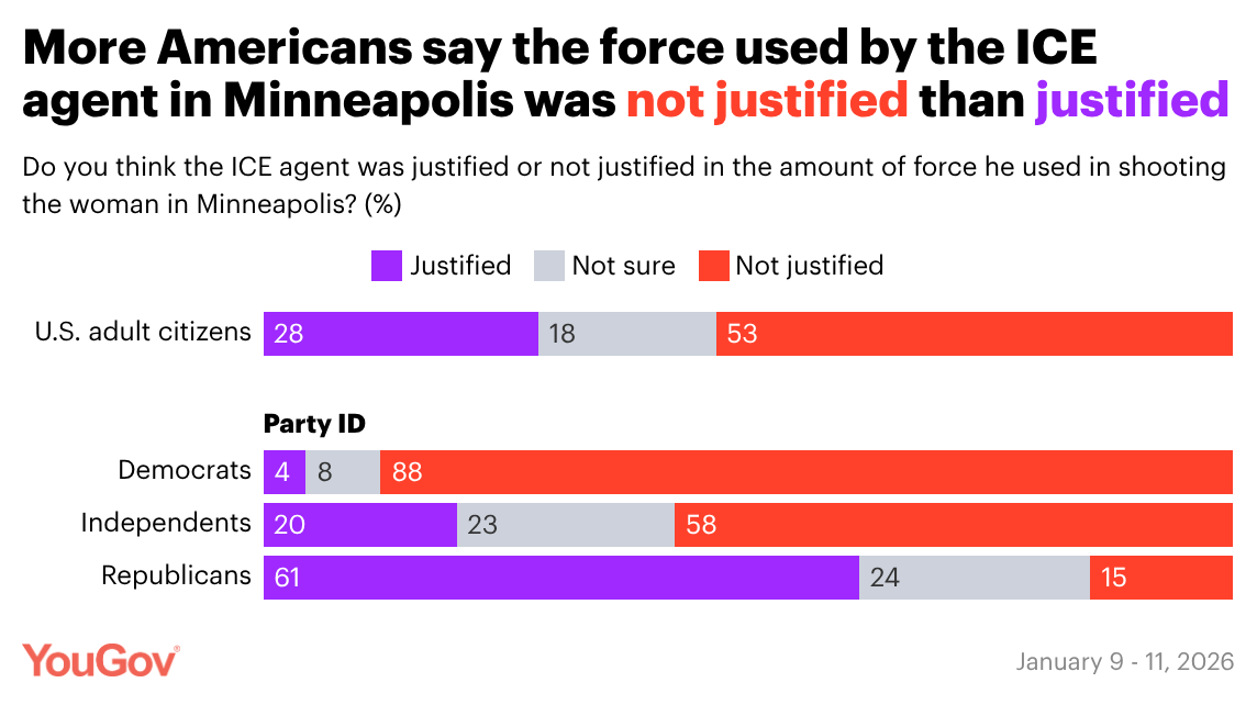 % who think the ICE agent should | shouldn't face criminal charges for shooting the woman in Minneapolis