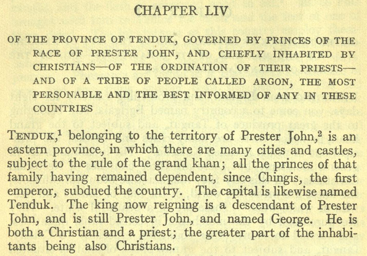 First attested to by Marco Polo in the 13th century, Prester John of Tenduc wasn't the same Prester John of Africa of more famous later legend, but he was said to have descended from an earlier figure of the same name - Presbyter John of Syria (John of Patmos and/or the Disciple)