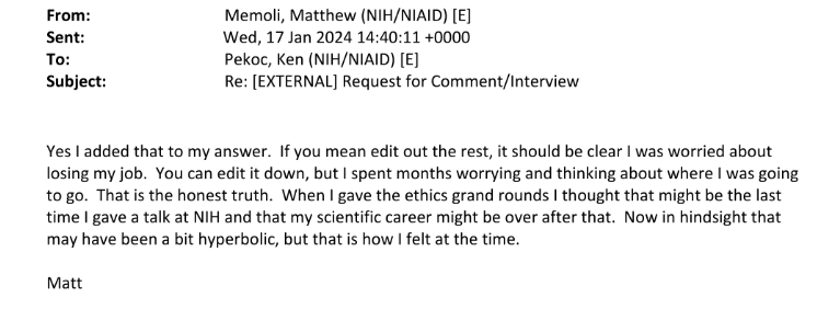 Dr. Matthew Memoli, at the time a unit leader at the National Institute of Allergy and Infectious Diseases, said that he "spent months worrying and thinking about where I was going to go."