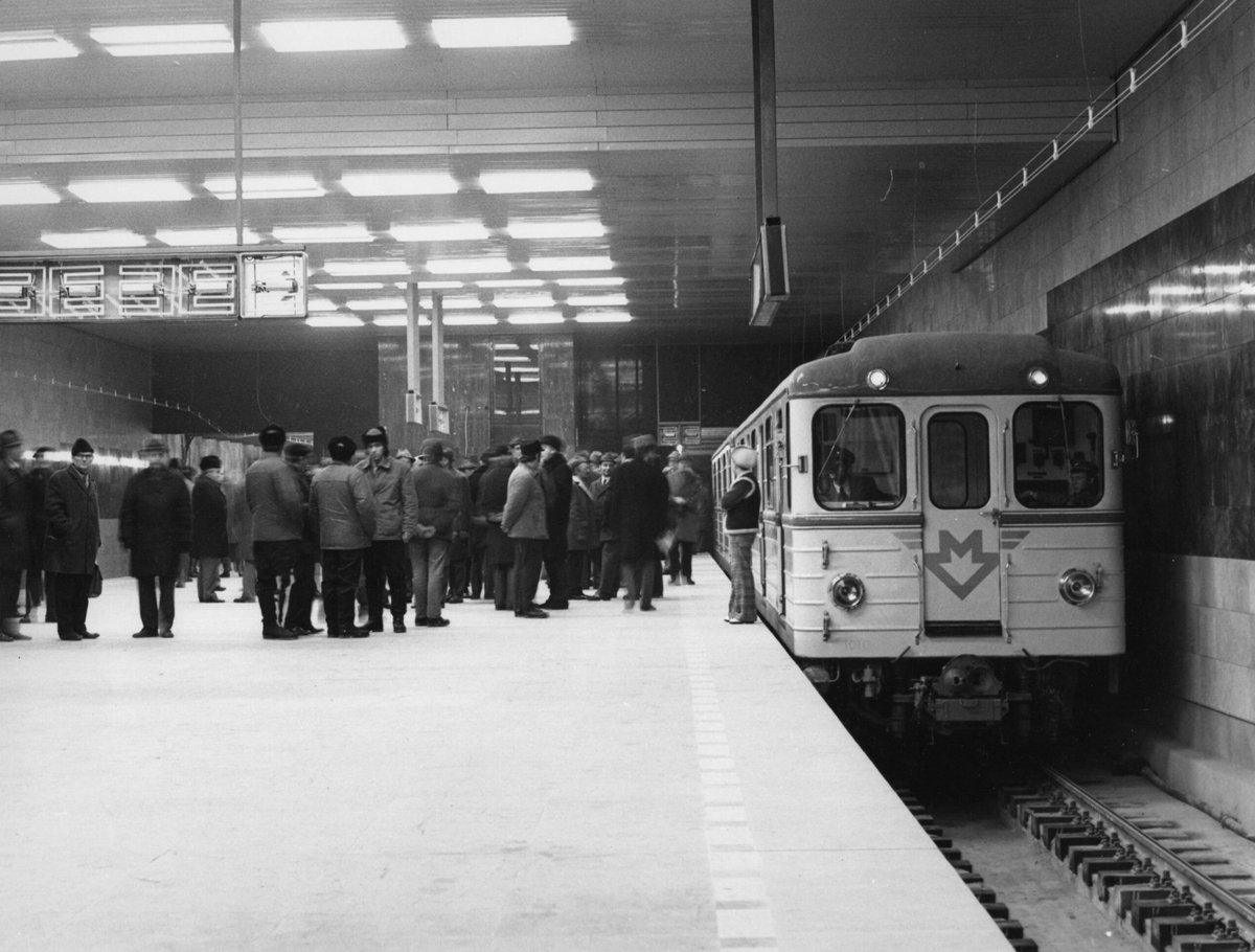 První ale bylo Céčko. Tohle je foto ze zkušebního provozu z ledna 1974. Zahájení běžného provozu metra na jeho prvním úseku mezi Kačerovem a Florencí (tehdy Sokolovská) proběhlo ten samý rok v květnu.