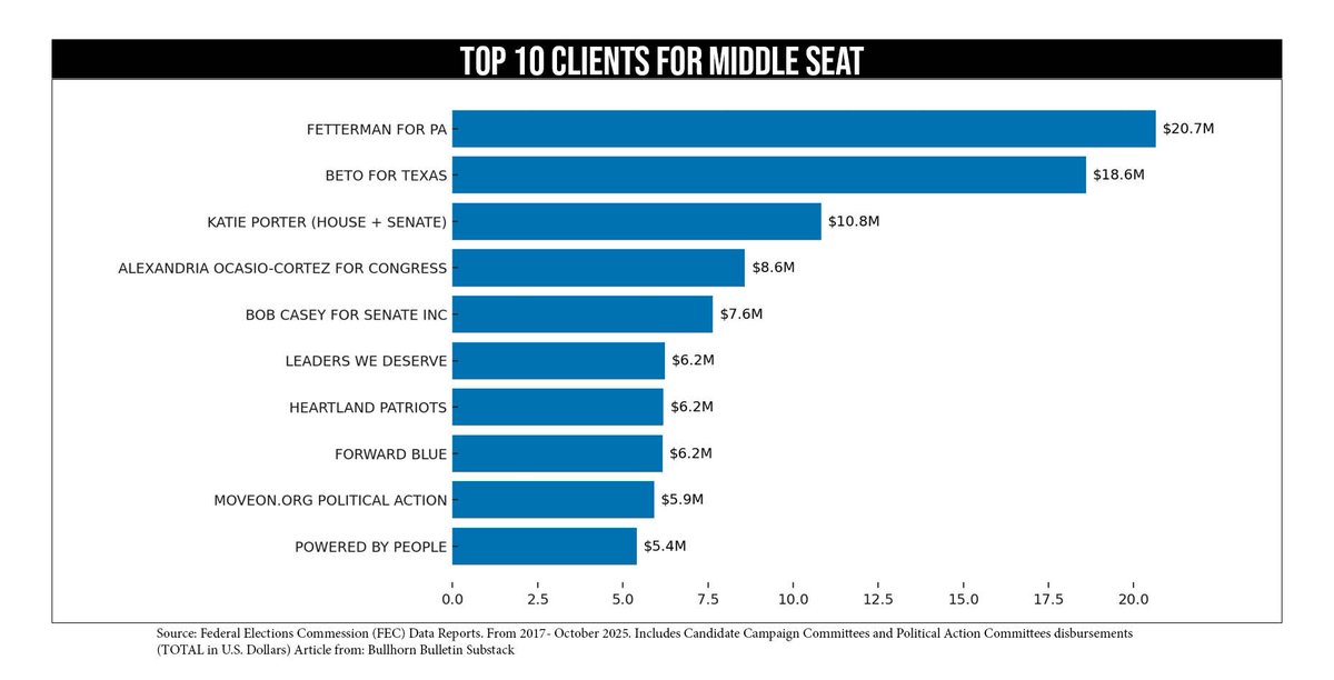 Campaign consulting is a massive industry, and Middle Seat has made more than $134 million since 2017, according to FEC data. Fetterman for PA $20.7 M, Beto O’Rourke $18.6 M, Katie Porter $10.8 M, AOC $8.6 M, and David Hogg's PAC $6.2 M.