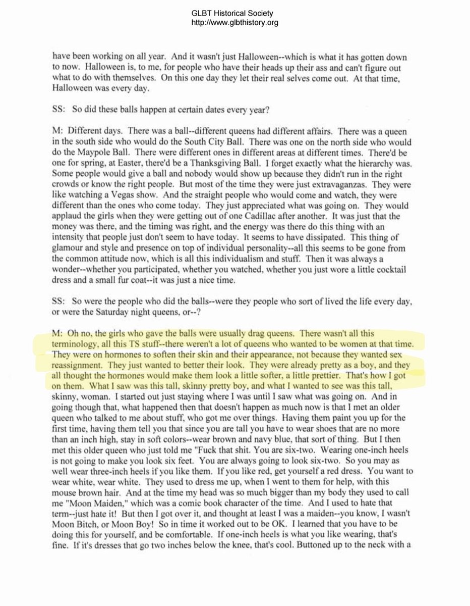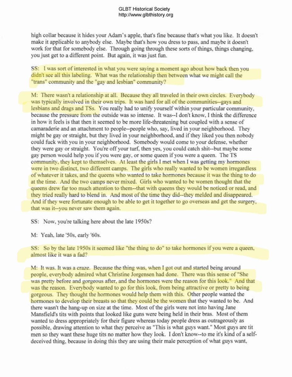 wanted anything to do with the other in the 50s into the 60s, and "there wasn't a relationship at all. Because they all travelled in their own circles", and that the gay drag queens and transsexuals did not mix.