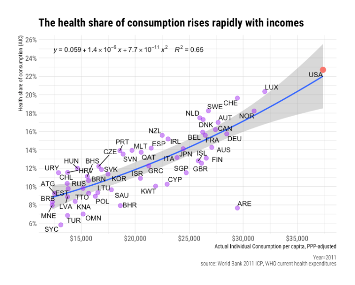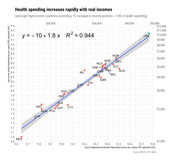 Some important stylized facts: 1. Healthcare spending is largely a function of income. Countries with higher incomes spend more on healthcare. Countries with lower incomes spend less on healthcare. The US spends so much more on healthcare because it is so much richer. 2. Once a basic level of healthcare is established, additional healthcare spending rapidly approaches zero return.