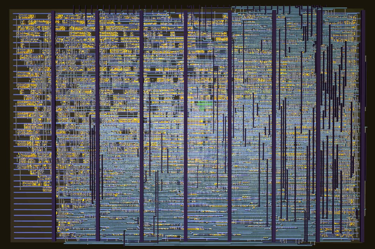 The chip is quite simple - it has 4 channels: 3 square tones and noise. The replica is less than 1500 logic gates and 64 chips like that could fit in 1 mm^2.