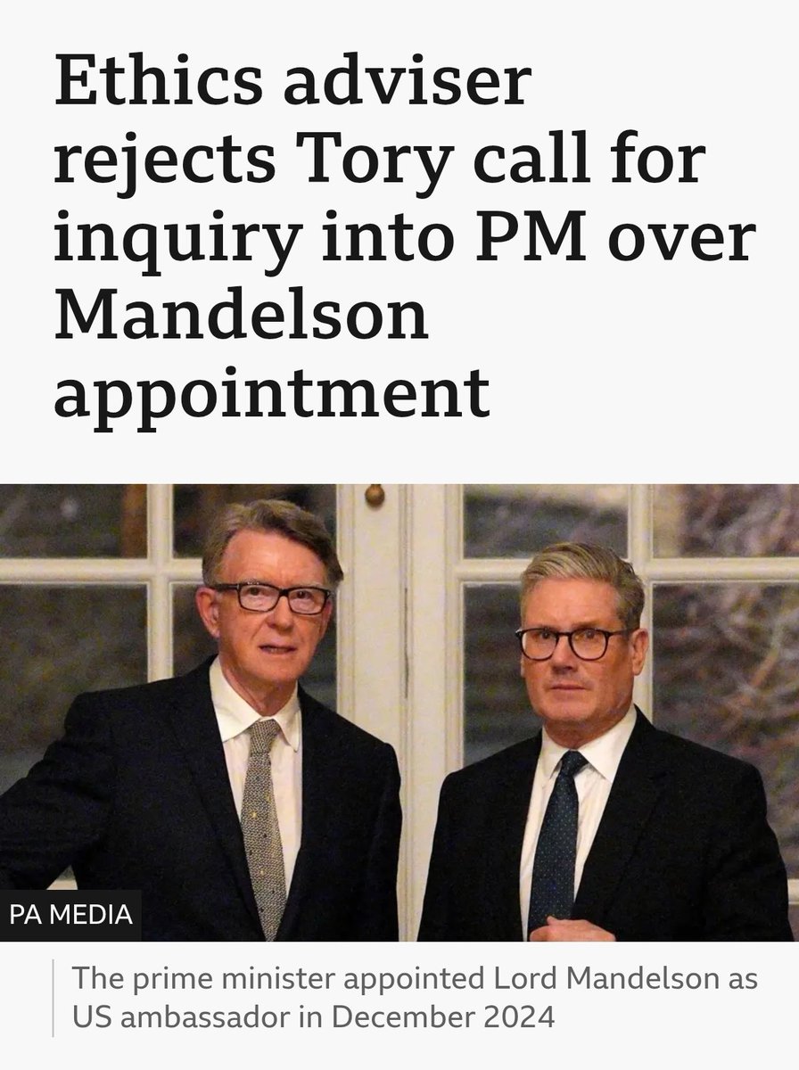 "The prime minister's independent ethics adviser has said he will not investigate Sir Keir Starmer over his appointment of Lord Mandelson as ambassador to the US."